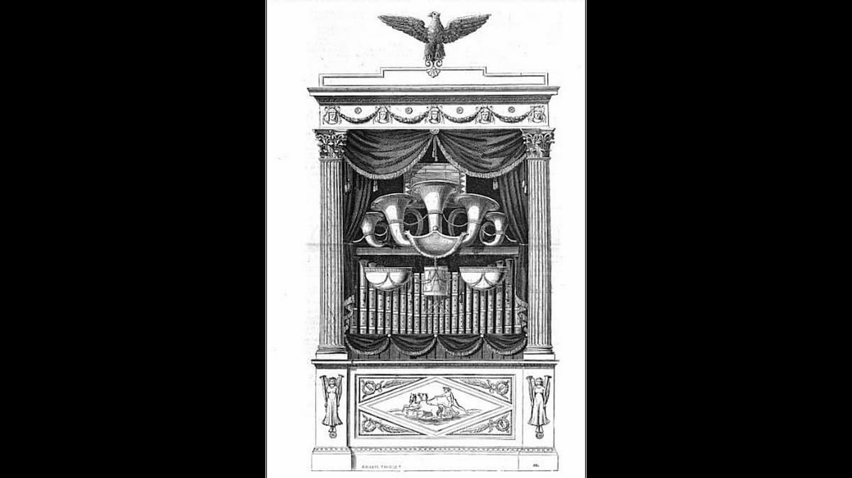 この機械は下の絵のようなもので、楽器の音だけでなく銃声や大砲の音を出すこともできたと言われています。